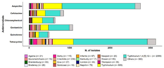Antimicrobial resistance to tetracycline (TET) and ampicillin (AMP) was extremely high in S. ser. Agama (TET 100%; AMP 95.2%), S. ser. Typhimurium 1,4,[5],12:i:- (TET 87.6%; AMP 86.5%), S. ser. Newport (TET 85%; AMP 55%), S. ser. Typhimurium (TET 83.9%; AMP 76%), S. ser. Rissen (TET 83.5%; AMP 34.1%), and S. ser. Derby (TET 81.7%; AMP 33.9%) (Figure 4).