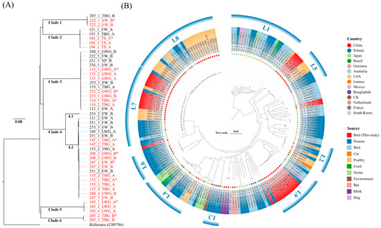 A maximum-likelihood phylogenetic tree based on 83,912 SNPs identified among 47 E. albertii isolates was constructed. Six main clades were observed in the phylogenetic tree (Figure 2). Three samples (sample ID: 121, 153, and 253) recovered 2–3 isolates each. These isolates separated into different clades. For example, isolates 121_1_EW_A and 121_2_EW_A were separated into Clade 2 and Clade 4.2, respectively. Isolates 153_1_TBG_A, 153_2_TBG_A, and 153_3_TBG_A were divided into Clade 3, Clade 4.2, and Clade 2. Isolates 253_1_EW_B, 253_2_EW_B, and 253_3_EW_B were grouped into Clade 3, Clade 4.1, and Clade 4.2. This may indicate that various clones of E. albertii coexisted in the same individual. Notably, some isolates from different migratory birds showed highly phylogenetical relatedness (e.g., Clade 3 and Clade 4.2), although the migratory birds were generally captured in different sites around Poyang Lake (Figure 2A).