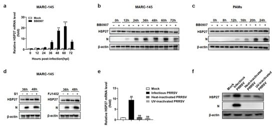 To investigate whether viral replication was necessary for the upregulation of HSP27, heat-inactivation and UV-inactivation of PRRSV were performed. Unlike infectious PRRSV, neither heat-inactivated PRRSV nor UV-inactivated PRRSV could increase HSP27 expression (Figure 1e,f). This result suggested that PRRSV replication was essential for the upregulation of HSP27.
