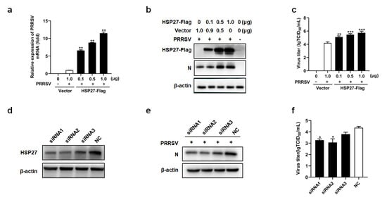 To explore the effects of HSP27 on PRRSV replication, overexpression and knockdown by specific siRNAs were performed with MARC-145 cells. Different doses of recombinant plasmid pcDNA3.1-HSP27-Flag or pcDNA3.1+ were transiently transfected into the MARC-145 cells. The cells were then infected with PRRSV. The results showed that PRRSV mRNA and N protein levels increased significantly with increasing pcDNA3.1-HSP27-Flag transfection doses (Figure 2a,b). Virus titers were measured by TCID50 assays. Consistent with the above results, PRRSV titers were also significantly increased in the pcDNA3.1-HSP27-Flag transfected groups (Figure 2c). The results indicated a direct positive correlation between HSP27 expression levels and PRRSV replication.