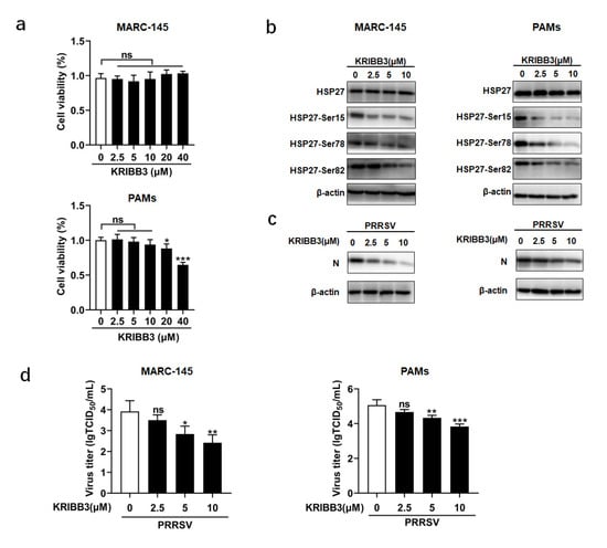 Further investigations were performed to determine whether the phosphorylation state of HSP27 plays a role in PRRSV replication. KRIBB3 was used, which is a specific inhibitor that can inhibit HSP27 phosphorylation [19]. We first tested the cytotoxicity of KRIBB3 on MARC-145 cells and PAMs to determine the optimal concentration using a CCK-8. Cytotoxicity could not be detected in MARC-145 cells when 40 μM KRIBB3 was used. PAMs were more sensitive to KRIBB3, and toxicity could be found at a concentration of 20 μM (Figure 4a).