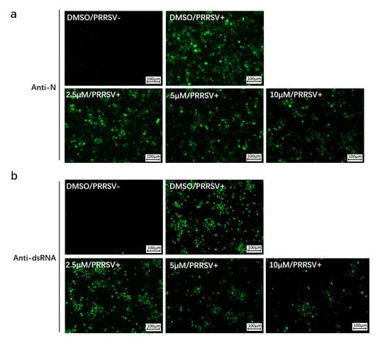 Cells were washed with PBS and fixed for 20 min with 4% paraformaldehyde at room temperature. After washing three times with PBS, the cells were permeabilized for 30 min with Immunostaining Permeabilization Solution with Saponin (Beyotime Biotechnology, Shanghai, China). The cells were then incubated with a monoclonal antibody against PRRSV-N protein (1:100) or dsRNA (1:200) overnight at 4°C. After being washed with PBS, the cells were incubated with Alexa Fluor 488-conjugated goat anti-mouse IgG (1:300) (Proteintech, Chicago, IL, USA) for 1 h at 37 °C. After an additional wash with PBS, fluorescence images were observed using fluorescence microscopy (Zeiss Vert. A1; Carl Zeiss Microscopy GmbH, Oberkohen, BW, Germany).