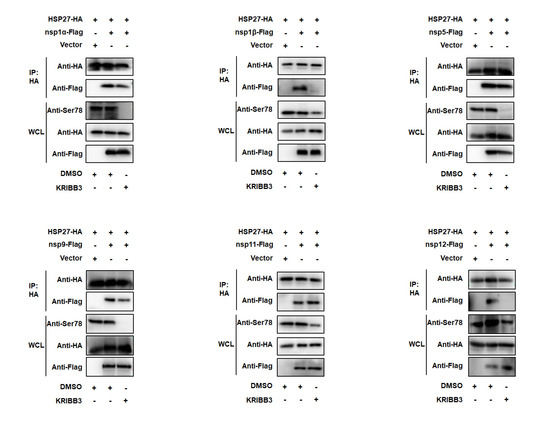 Considering that HSP27 can be phosphorylated during PRRSV infection and that suppressing the phosphorylation of HSP27 reduced virus replication, we then analyzed the effect of HSP27 phosphorylation on its interaction with viral nsps. We tested the cytotoxicity of KRIBB3 on HEK-293T cells. Toxicity could not be found below 10 μM (Figure S1). Therefore, future experiments were performed with KRIBB3 at 10 μM. HEK-293T cells were cotransfected with HSP27 and PRRSV-nsps expression vectors and then incubated with DMSO or 10 μM KRIBB3. As shown in Figure 7, KRIBB3 almost completely interrupted the interaction of HSP27 with nsp1β and nsp12 and could influence the interaction of HSP27 with nsp1α, nsp5, and nsp9 to some extent. However, the interaction between HSP27 and nsp11 was not influenced by KRIBB3.