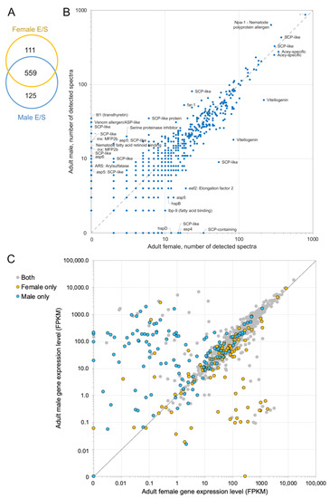 Distribution of ESPs proteins among female and male A. ceylanicum. (A) A Venn diagram showing the number of detected proteins in the ESPs of female and male A. ceylanicum. (B) A comparison of the relative abundance of proteins in the female and male samples, quantified by total number of spectra. Sex-specific ESPs are positioned along the X and Y axes. Brief functional annotations are provided for proteins with high sex specificity, and high overall abundance in both samples. (C) The corresponding adult-stage mRNA level for each of the ESPs in female and male A. ceylanicum [45].
