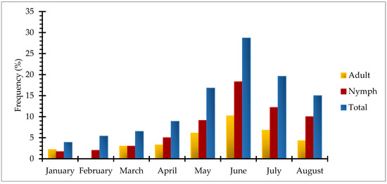 - Iqbal, A.; Sajid, M.S.; Khan, M.N.; Khan, M.K. Frequency distribution of hard ticks (Acari: Ixodidae) infesting bubaline population of district Toba Tek Singh, Punjab, Pakistan. Parasitol. Res. 2013, 112, 535–541. [Google Scholar] [CrossRef]