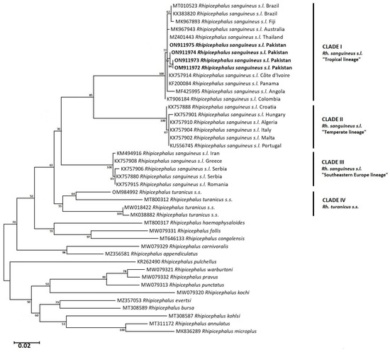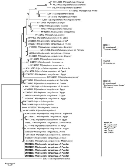 3.6. Phylogenetic Analysis: Maximum Likelihood (Rh. sanguineus complex)