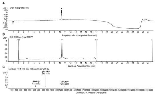 HPLC (A,B) and MS (C) profiles of purified Oreoch-1. The retention time (tR) value of the target peptide was about 10.4 min (A,B). (C) MS analysis showed the expected mass for Oreoch-1 at m/z: 1263.667, [M+2H]+; 842.783, [M+3H]2+; 632.339, [M+4H]3+. The experimental MW of 2525.36 Da coincides with the theoretical monoisotopic mass 2525.39 Da. (*) indicates the chromatographic peak containing the target peptide.