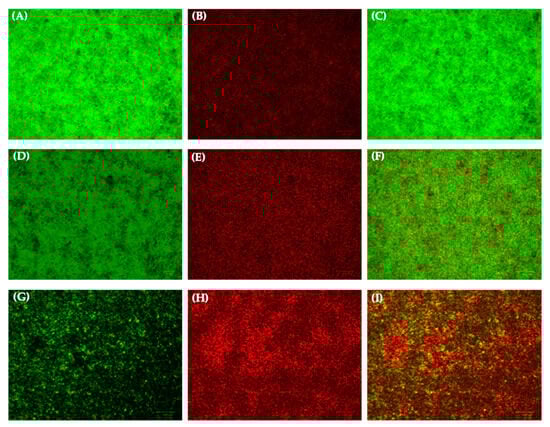 Images of S. aureus ATCC 25923 biofilm, stained with LIVE/DEAD Kit, acquired via fluorescence microscopy: (A–C) untreated sessile population (CTR−); (D–F) bacteria exposed to 12.5 μM of Oreoch-1; (G–I) bacteria exposed to 25 μM of Oreoch-1.