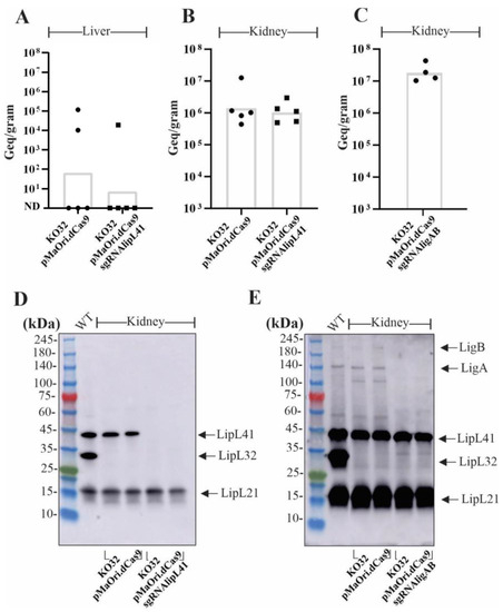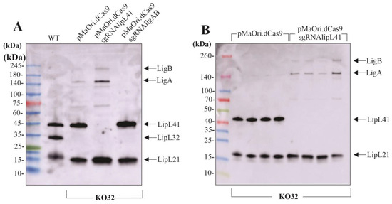 - Fernandes, L.G.V.; Teixeira, A.F.; Nascimento, A.L.T.O. Evaluation of Leptospira interrogans knockdown mutants for LipL32, LipL41, LipL21, and OmpL1 proteins. Front. Microbiol. 2023, 14, 1199660. [Google Scholar] [CrossRef]