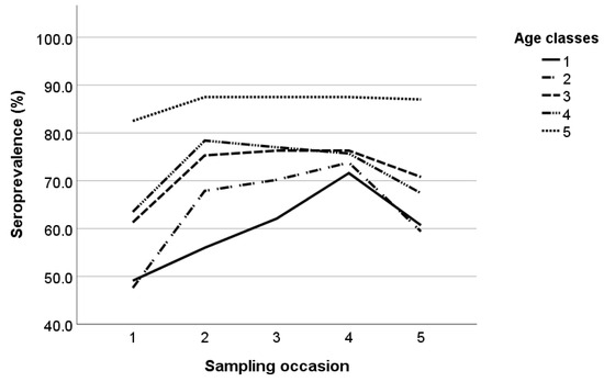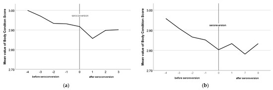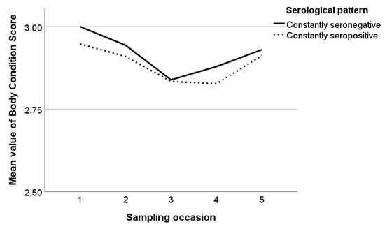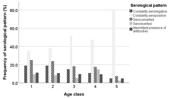 | Seropositivity in animals with an intermittent presence of antibodies | Age | - | −0.134 | 0.87 | 0.70–1.09 | ns |