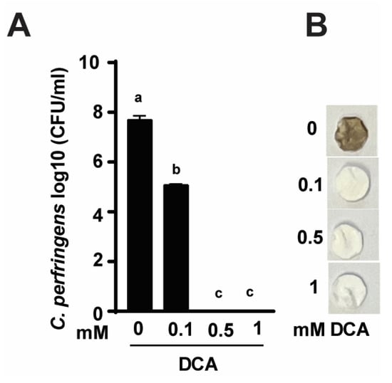 3.1. DCA Reduces C. perfringens Strain CP1 Growth and H2S Production