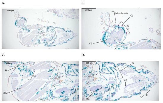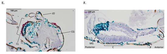 C. sonorensis fed a BTV-10-spiked blood meal had a staining detection of 2 out of 15 midges (Table 1). There was evidence of the dissemination of BTV-10 beyond the midgut in one specimen, with the presence of BTV-10 evident in the salivary gland, follicular epithelium, fat body, and cuticle. BTV-10 was absent in the ovarian follicles (Figure 4). However, the second specimen with BTV-10 detection had most of the virus localized to the midgut, with intensive staining (Figure 4C,D and Table 2).