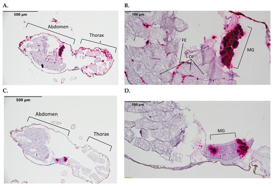 C. sonorensis 10 days post BTV-10 blood meal sections. Stained with BTV-10 and BTV-17 segment 2 probes. BTV-10 probe (Channel 2) binding is red staining. (A) Full body at 10×. (B) Abdomen at 40×. (C) Full body at 10× with limited BTV dissemination. (D) Abdomen at 40× of same specimen from (C). Labeled tissues: MG, midgut; OF, ovarian follicles; FE, follicular epithelium.