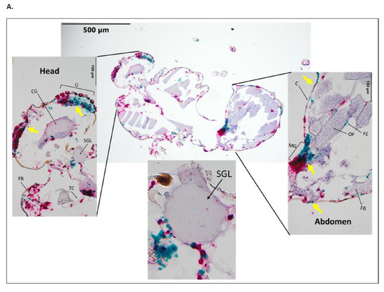 Sections from C. sonorensis collected 10 days after combined BTV-10 and BTV-17 blood meal. Stained with BTV-10 and BTV-17 segment 2 specific probes. BTV-10 probe (Channel 2) binding is red staining, and BTV-17 probe (Channel 1) binding is green staining. Yellow arrows indicate examples of overlap of red and green staining. (A) Disseminated BTV-10 and BTV-17 co-infection at 10× with head, salivary gland lumen, and abdomen at 40×. (B) Disseminated BTV-17 with BTV-10 localizing to midgut at 10× and thorax and abdomen at 40× (C) Disseminated BTV-17 with BTV-10 absent at 10× and thorax and abdomen at 40× Labeled tissues: O, ommatidia; CG, cerebral ganglion; FB, fat body; TC, tracheal cuticle; SGL, salivary gland lumen; C, cuticle; CL, corneal lens; DLM, dorsal longitudinal muscle; MG, midgut; OF, ovarian follicle; FE, follicular epithelium.