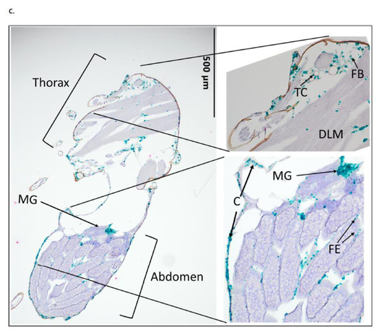 Both virus serotypes had similar tissue tropisms and were routinely detected in the ommatidia, cerebral ganglion, fat body, tracheal cuticle, and cuticle. While pathological changes and metabolic alterations are difficult to assess in invertebrates via histology, the presence of virus in these tissues may provide a connection to understanding changes in an infected insect. Zika virus infection in the Aedes aegypti vector demonstrated neurotropism connected to behavioral changes that could be considered advantageous for virus transmission [42]. Notable changes in virus-infected insects include alterations in the midgut lipid metabolism in Aedes aegypti infected with dengue virus, deviations in the foraging behavior of Solenopsis invicta infected with Solenopsis invicta virus 3, and altered susceptibility of Drosophila melanogaster to certain bacterial and fungal pathogens when infected with Galbut virus [43,44,45]. Ichnovirus from Hyposoter didymator induces apoptosis in the fat body cells of Spodoptera frugiperda larvae, resulting in modulated immunity [46]. As more life trait and metabolomic studies elucidate the changes occurring in BTV-infected C. sonorensis, knowledge of BTV tissue tropism will assist in understanding the pathogenesis.