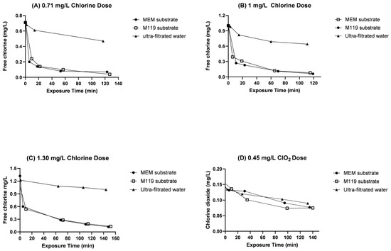 Test of internalization for the show free chlorine residuals after exposure to both MEM substrate and M199 substrate. The chlorine reactions were tested in three doses 0.7, 1.0, and 1.30 mg/L in (A–C). Chlorine dioxide dose tested was 0.45 mg/L with a contact time of 120 min (D).