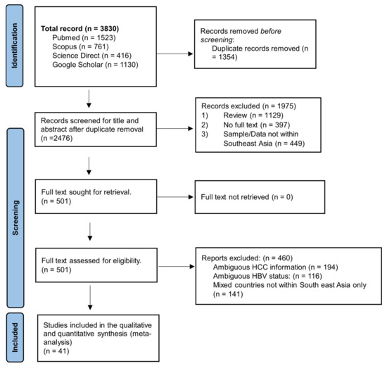 Our thorough search of four electronic databases yielded a total of 3830 articles. We carefully examined every record and removed duplicates to provide a well-curated selection of 2476 articles. After additional screening based on titles and abstracts, 1975 items were eliminated, leaving 501 papers for in-depth full-text review. However, 460 articles were disqualified during this evaluation stage because they did not adhere to the inclusion criteria. Figure 1 shows a thorough representation of the selection procedure. In the end, 41 publications were analysed, totalling 39,050 HBV patients and 7479 HCC cases in southeast Asia.