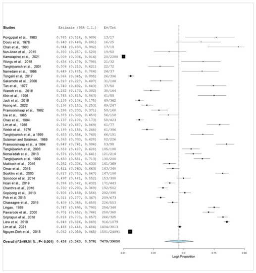 The heterogeneity in the distribution of HCC cases among the 41 studies highlights the variety of demographics and clinical settings under study. Table 1 shows that Singapore had the largest number of HCC cases (2743 cases), while Cambodia had the lowest number (226 cases). The high incidence of HBV and the lack of success of national immunisation programmes and schemes are the most likely causes of the high prevalence of HCC in this country [72,73,74,75]. The extensive range of HCC case counts reflects the regional differences and heterogeneity in the incidence and consequences of HBV-related HCC in Southeast Asia [76]. The estimates in this study put the combined prevalence of HCC among HBV cases in this area at 45.8%. The high rate of hepatitis B infection in Southeast Asia and its accompanying comorbidities and consequences can be blamed for the high burden of HCC in HBV cases there. The results of this study agree with those of earlier studies [77,78,79,80].