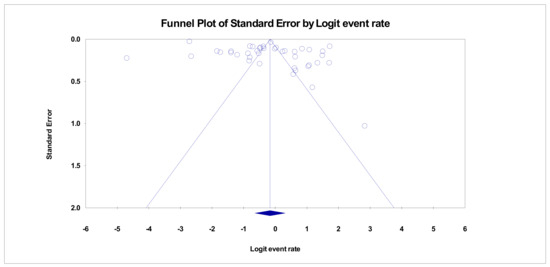A forest plot of the pooled prevalence is shown in Figure 2, illustrating the significant burden of HCC in HBV cases in Southeast Asia. There was no publication bias among the recruited studies; the probable reason for this could be due to the quality of the recruited studies and the variability and dynamics of the recruited studies. The results of this study complement the reports of Zhu et al. (2016) and Wiangnon et al. (2012) [88,89]. Additionally, a funnel plot was created (Figure 3) to evaluate the possibility of publication bias in the pooled prevalence estimates of HCC and HBV in Southeast Asia. The plot shows a symmetrical distribution of studies around the pooled prevalence, indicating no publication bias, which increases confidence in the derived estimates.