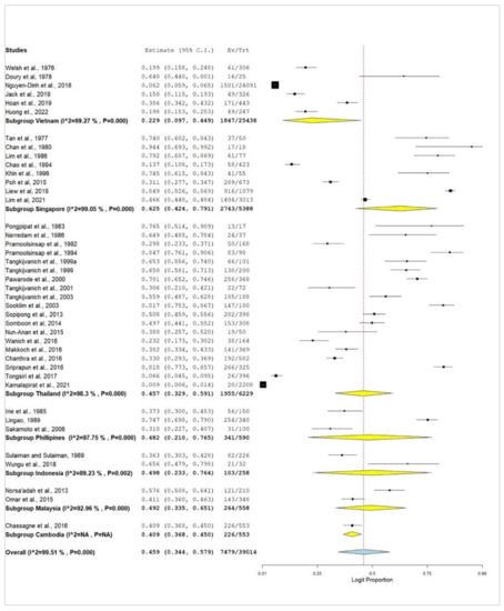 Subgroup forest plot of HCC in HBV within southeast Asia in relation to the country of study [5,6,8,33,34,35,36,37,38,39,40,41,42,43,44,45,46,47,48,49,50,51,52,53,54,55,56,57,58,59,60,61,62,63,64,65,66,67,68,69,70].
