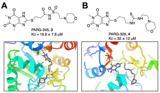 Knowing that poly(ADP-ribose) glycohydrolases (PARGs) are structurally related to Mac1, and that there are several PARG inhibitors, Brosey et al. utilized virtual screening and scaffold optimization to identify PARG-inhibitor-related morpholine-based structures that might also bind to Mac1 [24]. From this work, the group discovered two compounds, PARG-345 (3) and PARG-329 (4), that interacted with Mac1 via crystallography. Both compounds anchor the methylxanthine head in the adenine binding site. The morpholine group on PARG-345 interacts with N40 while the sulfonyl linker makes backbone contacts with the G130 and F132 residues of Loop 2 (Figure 2A). Conversely, the thio-urea of PARG-329 interacts with Mac1 largely through water-mediated contacts. The morpholine group extends further into the active site but loses the hydrogen bonding with N40 (Figure 2B). While these compounds interact with Mac1, demonstrating KD values of between 16.6 and 32 μM, no further reports have been published demonstrating any inhibitory activity of these compounds.