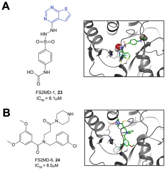 Figure 8. Top hit compounds were identified via high-throughput screening using an AlphaScreen assay. (A) Compound 23 contains a thienopyrimidine head group (blue) resembling the pyrrolopyrimidine head groups in compounds identified by Schuller et al. (B) Compound 24 contains a β-alanine core, a chlorobenzyl group, a methoxy benzoyl group, and a piperazine amide [32].