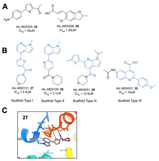 Schuller et al. utilized both virtual and high-throughput screening using the HTRF assay described previously to identify novel Mac1 inhibitors [33]. The virtual screening of 125,000 compounds from the BioAscent library in addition to HTRF screening of 1786 compounds identified two molecules, IAL-MD0305 (25) and IAL-MD0306 (26), with IC50′s of 28 and 18 μM, respectively (Figure 9A). Next, the screening of 10,100 small molecules from the Manchester Institute Diversity Set (MIDAS), as well as an array of FDA-approved compounds, identified four primary scaffold types, three of which contained a pyrrolopyridine core (Figure 9B). Preliminary SAR was able to be gathered due to the availability of several derivatives from each of these scaffold types. Scaffold type I, characterized by a furanyl-pyrrolo[2,3-b]pyridine structure, yielded six compounds with IC50 values below 9 μM and one at 25.3 μM. The top compound from this set, IAL-MD0131, 27, contains a morpholine amide and had an IC50 of 4.9 μM. Co-crystallization of 27 with SARS-CoV-2 Mac1 showed ligand binding at the adenosine binding site of the ADP-ribose binding pocket (Figure 9C). This was mediated via interactions between the scaffold backbone and the residues I23 and F156, resembling those established by ADP-ribose. Scaffold type II was characterized by a pyridinyl-pyrrolo[2,3-b]pyridine, with the top-performing compound from this scaffold being IAL-MD0128, 28, with an IC50 of 3.1 μM. Scaffold III was characterized by a thiophenyl-pyrazolo[3,4-b]pyridine core with the most potent compound identified also containing a morpholino amide IAL-MD0051, 29, with an IC50 of 13 μM. Scaffold type IV was defined by phenylquinoline-4-carboxylic acid, and the most potent derivative identified in this series was IAL-MD0031, 30, with an IC50 of 19 μM.