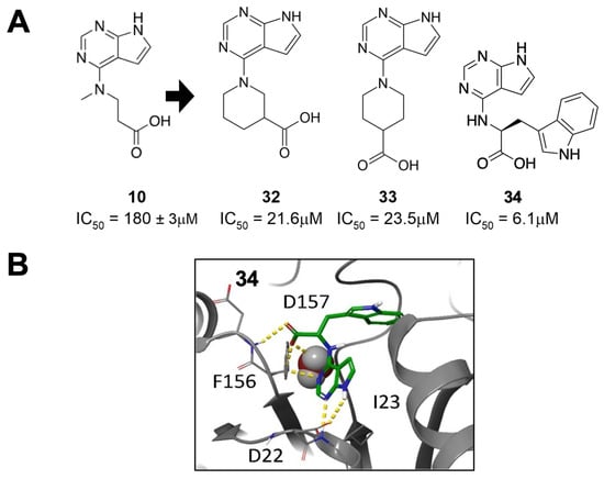 Figure 11. Primary and secondary amino acid derivatives of 10 showed improved Mac1 binding. (A) Compounds 3234 improve the IC50 of 10 20- to 30-fold. (B) Molecular model of 34 with Mac1 demonstrates that the tryptophan extends deep into the phosphate-binding pocket [34].