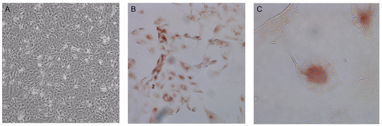 The primary hepatocytes which were isolated from the fresh livers of young piglets were monitored daily for at least one week by microscopic inspection until a monolayer was formed (Figure 2A). In the microscope observation we identified mainly hepatocytes and a few fibroblasts. To confirm the presence of hepatocytes, which we attempted to isolate, we labelled them with hepatocyte-specific anti-HNF4A (Figure 2B,C). Only of the hepatocytes the nucleus were coloured red in the IPMA. The fibroblasts were not labelled with the anti-HNF4A.