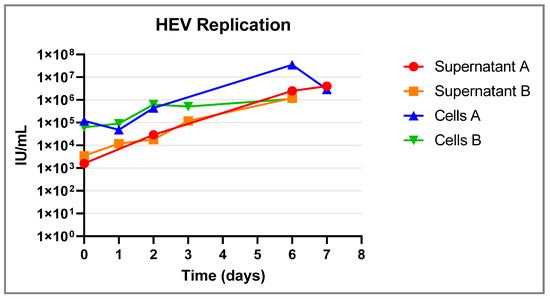 Hepatocytes were inoculated with an HEV-positive sample at D0. Subsequently, and at specific time points (marked with a dot), a supernatant sample and a cell-fraction sample were taken. The experiment was performed twice at different time moments. The samples of both experiments were tested in an HEV real-time RTPCR assay to detect HEV RNA. Results are plotted in the graph.
