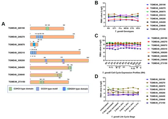 Bioinformatics analysis of selected zinc finger motif-containing Proteins (ZFPs) in Toxoplasma gondii. (A) The models of ZFPs predicated by SMART (Simple Modular Architecture Research Tool) (http://smart.embl.de, accessed on 3 October 2023) and NCBI’s Conserved Domain Database (CDD) (https://www.ncbi.nlm.nih.gov/Structure/cdd/cdd.shtml, accessed on 3 October 2023) showed that eight ZFPs contain the C3HC4-type domain, CCCH-type motif, or CDGSH-type domain. (B–D) The transcriptomic data for zfp genes were obtained from ToxoDB (http://ToxoDB.org, accessed on 3 October 2023), including transcriptional profiles of zfp genes in different genotypes (B), different cell cycle expression profiles (RH) (C), and developmental expression profiles of parasite life cycle stages (D).