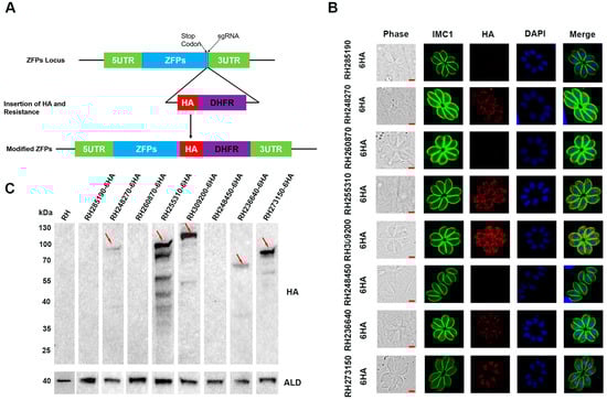 To investigate the expression and localization of ZFPs in the tachyzoite stage of the RH strain, we performed C-terminal endogenous tagging for eight ZFPs. CRISPR plasmid targeting the 3′-untranslated region (3′-UTR) of the zfp gene was obtained as previously described [17]. A short homology fragment containing 6 × HA tag products and DHFR fragments was amplified from the pLIC-6×HA-DHFR plasmid using specific primers located near the SgRNA at the 3′ end of the corresponding zfp gene. The purified fragment was co-transfected with successfully sequenced plasmid into RH∆ku80 strain. After selection with pyrimethamine, the positive single clones were confirmed using Polymerase Chain Reaction (PCR), followed by verification via the application of immunofluorescence analysis (IFA) and Western blotting. Table S1 contains the primers employed in the construction of C-terminal epitope tagging strains.