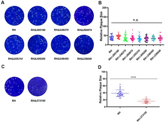 To further assess the impact of the deletion of the eight zfp genes on the overall growth of the RH strain, a plaque assay on HFF monolayers was conducted. The results showed that there were no significant differences in the number and size of plaques between the seven RHΔzfp strains (RHΔ285190, RHΔ248270, RHΔ260870, RHΔ255310, RHΔ309200, RHΔ248450, and RHΔ236640) and the WT strain (p > 0.05) (Figure 4A,B). However, the RHΔ273150 strain exhibited a significant reduction in plaque size (p < 0.05) (Figure 4C,D), suggesting that TGME49_273150 may play an important role in the parasite’s lytic cycle, which encompasses processes such as invasion, egress, and replication.