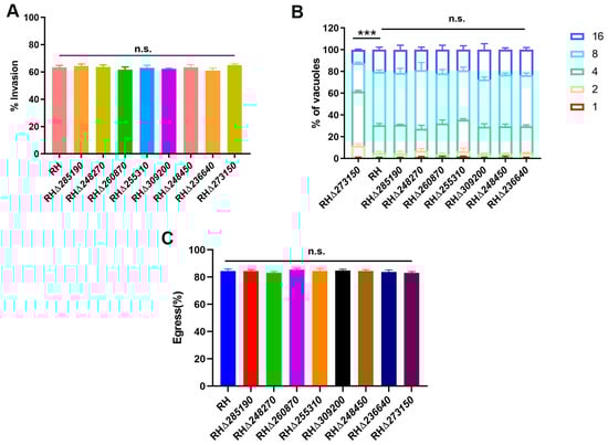 To evaluate which stage of T. gondii’s lytic cycle was affected by disruption of TGME49_273150, we first investigated the impact of the RHΔzfp strain on the early invasion process of T. gondii in host cells. The WT and RHΔzfp strains were allowed to invade the HFF monolayers for 30 min, and invasion efficiency was determined. The results revealed that there were no significant differences in invasion efficiency in eight RHΔzfp strains compared with the WT strain (p > 0.05), suggesting that the deletion of these eight zfp genes does not have a substantial impact on the invasion ability of T. gondii (Figure 5A).
