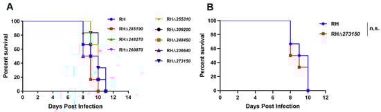 (A) Kunming mice (6 mice/strain) were injected intraperitoneally (i.p.) with 100 tachyzoites of the WT strain or the RHΔzfp strains. (B) Compared with the WT strain, the survival of RHΔ273150-infected mice (50 tachyzoites) was not significantly different. The infected mice were monitored daily. n.s., not significant.