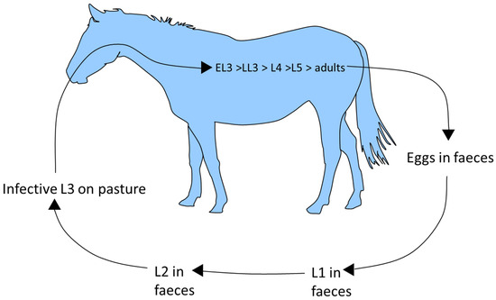 Horses ingest cyathostomin third stage larvae (L3) when grazing (Figure 1). These penetrate the large intestinal mucosa/sub-mucosa, where they become encysted within host tissue. Mucosal L3, classified as early L3 (EL3), can persist for up to 2.5 years [28,29,30] before they grow to late L3 (LL3) then moult to fourth stage larvae (L4), which emerge from the intestinal wall. The mucosal phase can be short, especially in animals that lack immunity (i.e., younger animals), in which the prepatent period, as assessed by FEC analysis after experimental infection with a mixed species isolate, has been measured as 5–6 weeks [31]. Larval emergence occurs in phases. A moult to L5 follows emergence of L4 into the intestinal lumen. Here, L5 mature to adults, which mate and release eggs which are excreted in faeces. The number of each developmental stage can vary immensely between horses, even in those of similar age and grazing history [32]. In faeces, eggs hatch to release first stage larvae, which then undergo two moults to reach infective L3. Egg hatching and rate of L3 development is climate-dependent. The L3 retain the cuticle of the second larval stage as a protective layer and can survive, even in freezing conditions, from one year to the next. These stages migrate from faeces to surrounding vegetation in order to infect the next host.