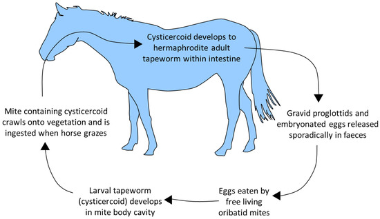 The body of A. perfoliata is composed of segments (proglottids) which each contain body systems and male and female reproductive organs. Mature tapeworms are differentiated into non-gravid adults (no eggs in terminal proglottids) and gravid adults (eggs in terminal proglottids) [38]. There is no opening to the uterus, so eggs are released sporadically when proglottids disintegrate, meaning that coproscopic detection of eggs is highly variable. In some studies, exclusively juvenile populations in individuals have accounted for up to 20% of infections [14,19,39]. Usually, mixed or adult-only populations account for most infections; however, in these reports, only a small percentage of adults (16–17%) were observed to be gravid and release eggs [18,21]. The life cycle is shown in Figure 2.