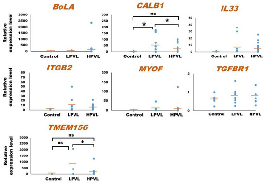 As for the 23 mRNAs, preliminary quantification by qPCR analysis was carried out using one control cattle (no. 1) and one BLV-infected cattle (no. 18) to determine whether these mRNAs were detected or not. In a prior investigation, ACTB was used as an internal control mRNA in milk sEVs for the normalization in qPCR [31,59]. Among the 23 mRNAs, a total of 7 mRNAs including bovine major histocompatibility complex (BoLA), calbindin 1 (CALB1), interleukin 33 (IL33), integrin subunit beta 2 (ITGB2), myoferlin (MYOF), transforming growth factor beta receptor 1 (TGFBR1), and transmembrane protein 156 (TMEM156) were detected by qPCR using the primers designed in this study. Finally, the relative amount of these mRNAs in milk sEVs was checked by qPCR analysis using 32 control (n = 6) and BLV-infected (n = 26) cattle. Importantly, the BLV-infected cattle were divided into two groups according to the criteria of PVL as LPVL, <10,000 copies/105 WBC (n = 8), and HPVL, ≥10,000 copies/105 WBC (n = 18) (Table 1) [33]. The results showed that the average relative amounts of CALB1, IL33, ITGB2, MYOF, and TMEM156 mRNAs were lower in milk sEVs from HPVL cattle compared to LPVL cattle but maintained at slightly higher levels compared to control cattle (Figure 2). Importantly, in the case of CALB1 mRNA, there was a significant difference observed in the milk sEVs from LPVL cattle compared with that of control cattle (p < 0.05). Notably, the average relative amount of BoLA and TGFBR1 in milk sEVs from LPVL cattle and control cattle was almost the same. On the other hand, the average relative amount of CALB1, IL33, ITGB2, MYOF, and TMEM156 mRNAs were lower in milk sEVs from HPVL cattle compared with LPVL cattle but maintained little bit high amount compared with control cattle. However, in the case of CALB1 and TMEM156 mRNAs, a significant difference was observed in the milk sEVs from LPVL cattle vs. HPVL cattle (p < 0.05). The average relative amount of BoLA mRNA in milk sEVs from HPVL cattle was high compared with LPVL cattle and control cattle but not significantly different (p > 0.05). In the case of TGFBR1 mRNA, the average relative amount in the milk sEVs from HPVL cattle was the same with LPVL cattle and control cattle. Notably, the average relative amount of CALB1 and TMEM156 in the milk sEVs from HPVL cattle compared with control cattle did not differ significantly (p > 0.05). The relative expression level of CALB1 and TMEM156 mRNAs in accordance with the control, LPVL, and HPVL cattle were demonstrated as a plot diagram in Supplementary Figure S2.