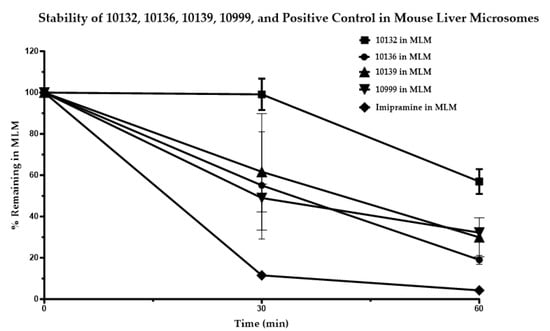The in vitro metabolic stability was determined in mouse liver microsomes []. To prepare a mouse liver microsomes (MLM) homogenate, 100 µL of microsomes was resuspended in 100 mM phosphate buffer (0.607 g K2HPO4 and 0.212 g KH2PO4 dissolved in 50 mL of de-ionized water), achieving a working concentration of 0.625 mg/mL. Positive control (Imipramine) and test compounds (FNDR-10132, 10136, 10139, and 10999) were spiked individually into the MLM homogenate at a final concentration of 1 µm. To pre-incubate, they were placed in a water bath at 37 °C for 5 min. At least 30 µL was collected in triplicates (0 min samples), and the reaction was quenched using 90 µL of acetonitrile, which contained 500 ng/mL of Carbamazepine as an internal standard. Nicotinamide Adenine Dinucleotide Phosphate (NADPH) in phosphate buffer was added to the remaining MLM at a 1 mM final concentration and further incubated at 37 °C. At the indicated time intervals, 30 µL aliquots were sampled in triplicates, and the reaction was quenched with acetonitrile containing Carbamazepine as the internal standard []. The samples were centrifugated for 10 min at 13,000 rpm, and the supernatant was separated for further analysis.