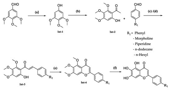 The synthesis of this series of compounds involved multiple steps as described in Scheme 1, starting with converting commercially available 3,4,5-trimethoxybenzaldehyde into 3,4,5-trimethoxyphenol. This conversion was achieved by reacting 3,4,5-trimethoxybenzaldehyde with m-CPBA. Next, an acetyl functional group was introduced to the phenyl ring using a Lewis acid, such as BF3·Et2O, which formed the desired intermediate-2. Following this, two different methods were employed to obtain the condensed product, intermediate-3. In step (c), intermediate-2 and an aldehyde condensation were combined using a strong inorganic base such as KOH in ethanol. Notably, in step (d), the compound FNDR-10142 was synthesized by reacting commercially available dodecanal with tri-methoxy substituted 2-hydroxy acetophenone in the presence of lithium diisopropylamide (LDA) in tetrahydrofuran (THF). Subsequently, these intermediates were cyclized with iodine using a catalytic amount of iodine, followed by demethylation with HBr in acetic acid to produce the desired compounds (Table 1).