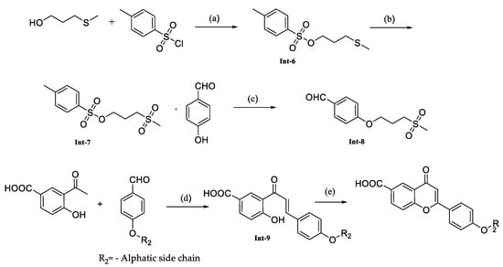 Reagents and conditions: (a) Dichloromethane, Pyridine, RT, 12 h; (b) Oxone, Water, Methanol, RT, 12 h; (c) K2CO3, DMF, 100 °C, 12 h; (d) Potassium Hydroxide, Ethanol, RT, 12 h; and (e) Iodine, DMSO, 100 °C, 16 h.