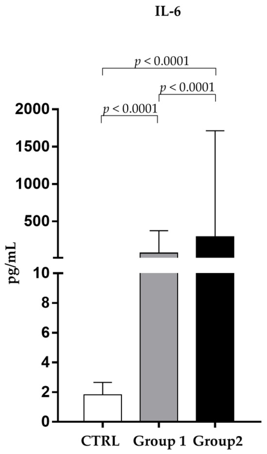 IL-6 concentration in patients serum (265.51 ± 976.82 pg/mL) was significantly (p < 0.0001) higher (about 145 fold) than in the control group (1.92 ± 0.58 pg/mL).