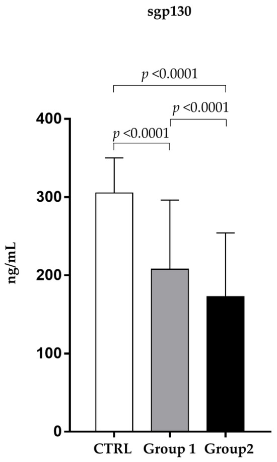 Contrarily, the amount of sgp130 in serum patients (181.52 ± 67.29 ng/mL) was 59% with respect to the control group (324.31 ± 43.58 ng/mL) (p < 0.0001).