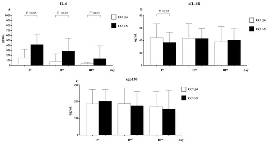 Patients with five points of the Charlson Comorbidity Index (CCI) had statically significant higher levels of IL-6 at day 1, day 2, and day 3 and lower levels of sIL-6R at day 1 (Figure 4).