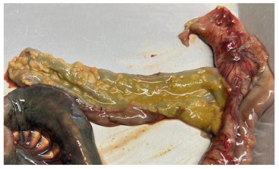 Salmonella infections in pigs are frequently asymptomatic, even though fecal shedding can occur continuously or intermittently, even over long periods of time, regardless of the presence of clinical signs. In symptomatic pigs, indistinguishable clinical signs can be observed after infection with S. Typhimurium and S. 1,4,[5],12:i:- [68], which are characterized by yellow diarrhea (rarely containing blood), dehydration, decreased feed intake, fever, inanition, and wasting. Debilitating conditions, such as poor hygiene and viral infections that induce immunosuppression, e.g., porcine reproductive and respiratory virus (PRRSV) and porcine circovirus 2 (PCV2), can trigger the onset of disease. Mortality is usually low and due to hypokalemia and dehydration, often occurring after several days of diarrhea [68]. After complete clinical recovery, a percentage of pigs can act as carriers and intermittent shedders for at least 5 months. The persistence of the organism is particularly frequent in submandibular and ileocolic lymph nodes, tonsils, and in the large intestine [68]; in addition to that, stressful conditions for the animals, e.g., commingling, transport, diet change, and lairage can increase shedding [69,70]. A few pigs may remain chronically wasted, and some may show obstipation and marked distension of the abdomen. This condition is described as a consequence of rectal strictures due to defective healing, with fibrosis, of ulcerative proctitis caused by S. Typhimurium [30]. Necrotic enterotyphlocolitis is the most consistent gross lesion in pigs suffering from S. Typhimurium. The lesions are mainly recorded in the ileum, cecum, and spiral colon, with the formation of diphtheritic membranes on the mucosal surface and roughened mucosa with a granular appearance. Systemic dissemination and septicemia are rare [68] (Figure 2).