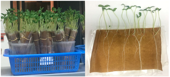 Nine (B1, B2, B20, B21, B23, B24, B27, B28, and B29) of the thirty bacterial strains with antagonistic activity and IAA-producing ability were evaluated for growth promotion of cucumber seedlings using the paper towel method in accordance with the International Seed Testing Association [48]. Cucumber seeds were surface sterilized with sodium hypochlorite (1% NaClO, 5 min) and rinsed three times with autoclaved distilled water. The bacterial strains were grown in NB medium with shaking (200 rpm) at 28 °C for 48 h. Then, the bacterial suspension was prepared and adjusted to 106–107 CFU/mL spectrophotometrically at 600 nm wavelength (Thermo Fisher Scientific, Waltham, MA, USA). The sterilized seeds were mixed with a bacterial suspension in a 50 mL flask at room temperature (140 rpm, 3 h). Sterile sieves were used to separate the seeds from the bacterial suspension. After bacterization, 25 seeds were placed in each germination paper and the paper was rolled and placed in a beaker with a suitable amount of sterile distilled water and maintained in a growth chamber at 28 °C for 10 days (Figure 1). Seeds treated only with water served as the control. Eventually, germinated seeds, and root and shoot lengths were measured to calculate the vigor index using the following formula: Vigor index = (mean shoot length + mean root length) × %Germination [49].