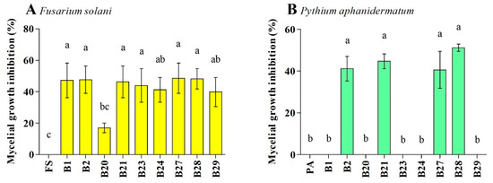 Effect of bacterial antagonists on the inhibition of Fusarium solani (FO) (A) and Pythium aphanidermatum (PA) (B) mycelial growths. Values show the means ± standard error (n = 3), and significant differences at p < 0.05 are indicated by different lowercase letters above the columns.