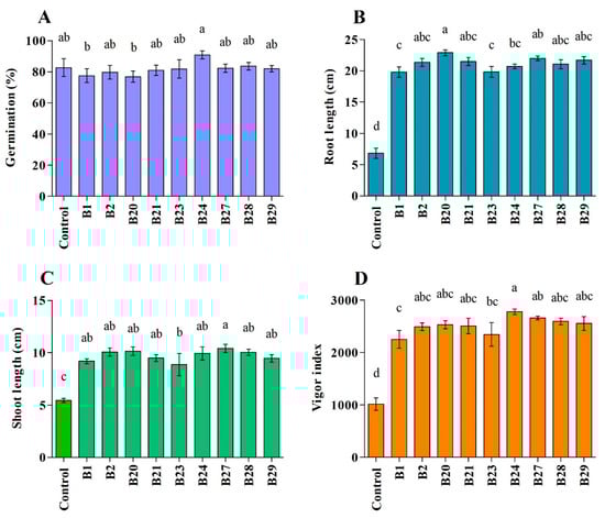 All of the tested strains promoted the growth of cucumber, as evidenced by the enhanced seedling vigor compared to the control. The seeds’ germination percentage varied among all strains, ranging from 76.7 to 90.7%. The bacterial strains B24 and B20 were the most active in promoting germination (90.7%) and root growth (22.8%), respectively. In addition, B27 and B24 resulted in the highest shoot length (10.4%) and seedling vigor (63.4%), respectively (Figure 5).
