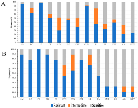 Antimicrobial susceptibility testing was performed by using the disk diffusion method on Mueller–Hinton agar plates according to the guidelines set by “The Clinical and Laboratory Standards Institute” (CLSI, 2022) [23]. The antimicrobial resistance was carried out for eighteen antimicrobials grouped in twelve families for Gram-negative and Gram-positive bacteria (antibiotics recommended by CLSI). Pseudomonas aeruginosa ATCC 27853, E. coli ATCC 25922, and S. aureus ATCC 25923 were used as controls. The results were inferred as susceptible or resistant by measuring the diameter of the inhibition zone according to the criteria specified by the CLSI (2022). The frequency of antibiotic sensitive, intermediate, and resistance were calculated and represented in percentages.