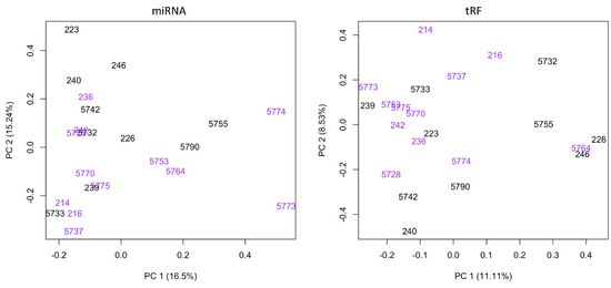 Principal component analysis (PCA) shows variation in miRNA and tRF expression between progeny born to BLV negative (black text) and BLV positive (purple text) animals. The x-axis represents the first principal component (PC1), which shows the individuals with the most variability with regards to miRNA and tRF expression. The y-axis represents the second principal component (PC2), which reveals additional relationships in the data that are not explained by PC1. PC1 and PC2 represent linear combinations based on the gene expression data and are used to calculate maximum variance in the dataset. PC1 explains the most variation and PC2 explains the second most variation.